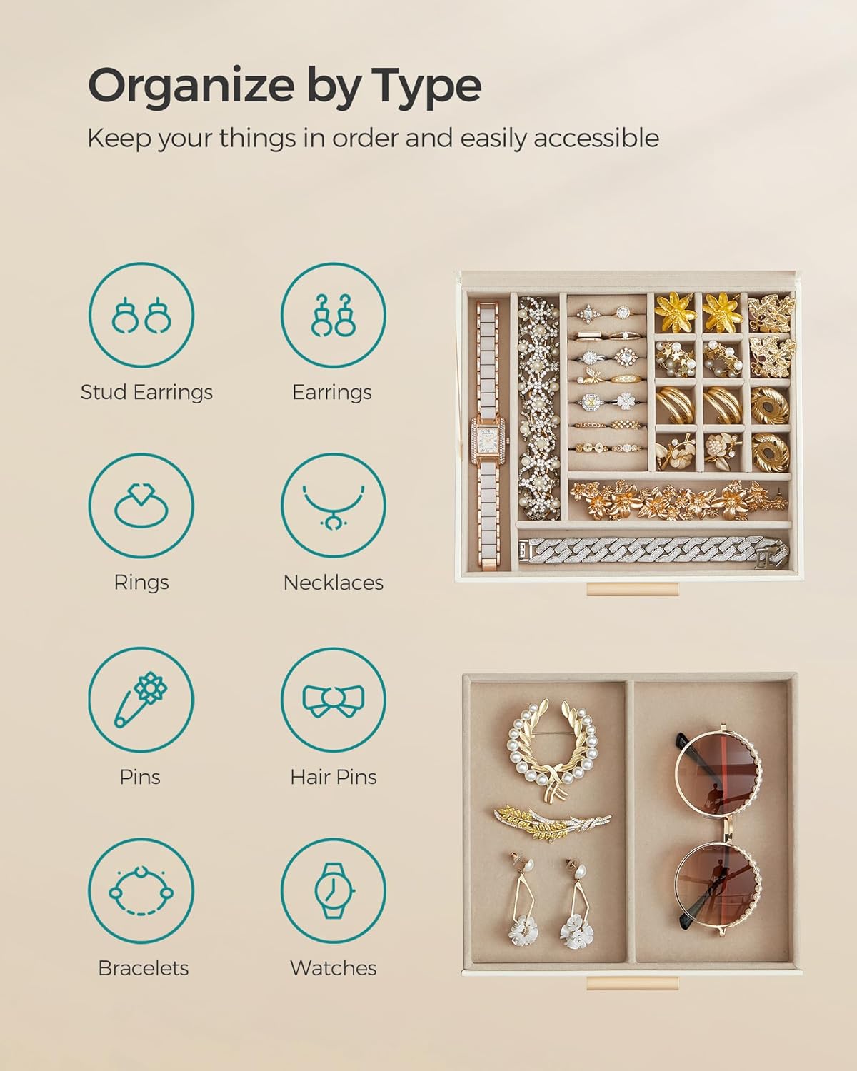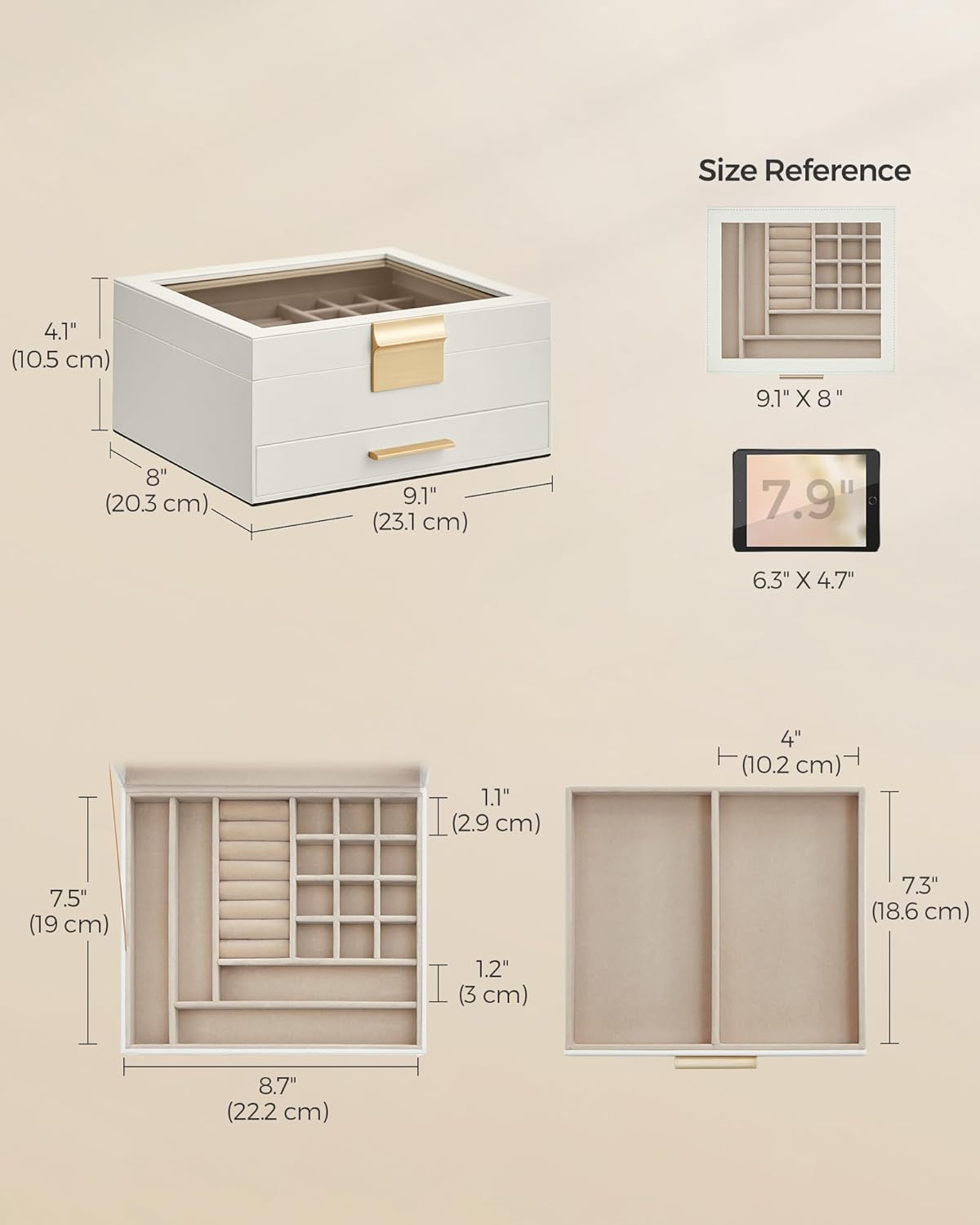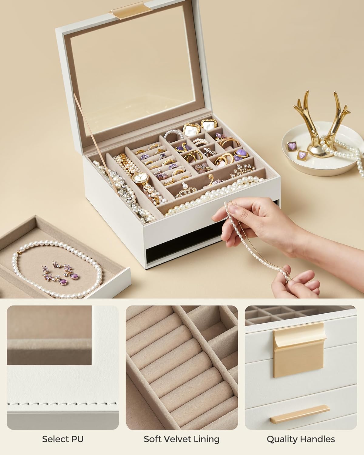 SONGMICS ジュエリーボックス ガラス蓋付き 2層 ジュエリーオーガナイザー 1段 ジュエリー収納 モダン ギフトアイデア クラウドホワイト/ゴールドカラー UJBC174W01
