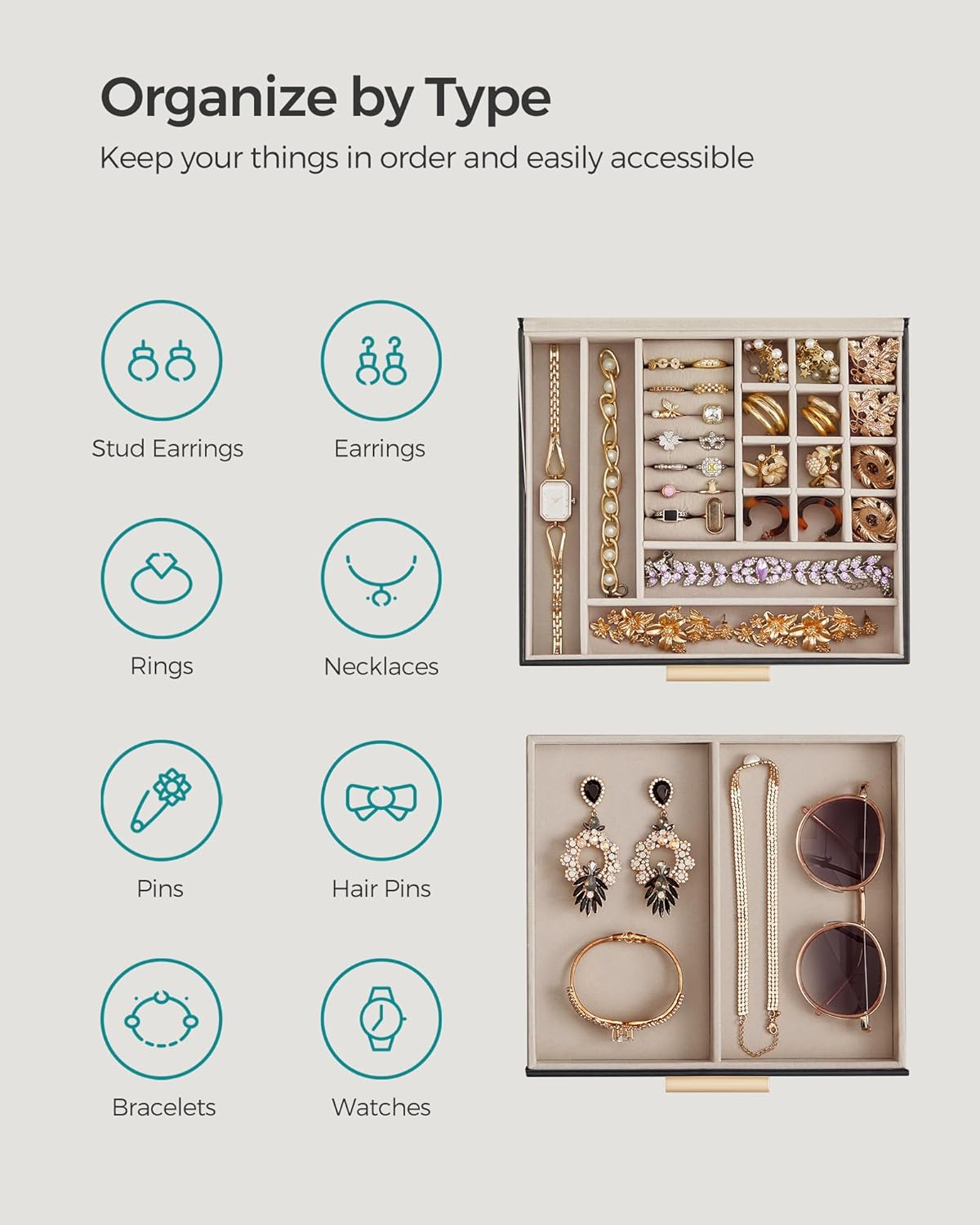 • [シックで耐久性] エレガントなブラックとゴールドの色、光沢のあるメタルハンドル、柔らかいベルベットの裏地、きちんとしたステッチ、高品質のPU、頑丈なMDF - これらすべての要素が組み合わさったこのジュエリーケースは、増え続けるジュエリーコレクションに十分なスタイリッシュで耐久性があります。